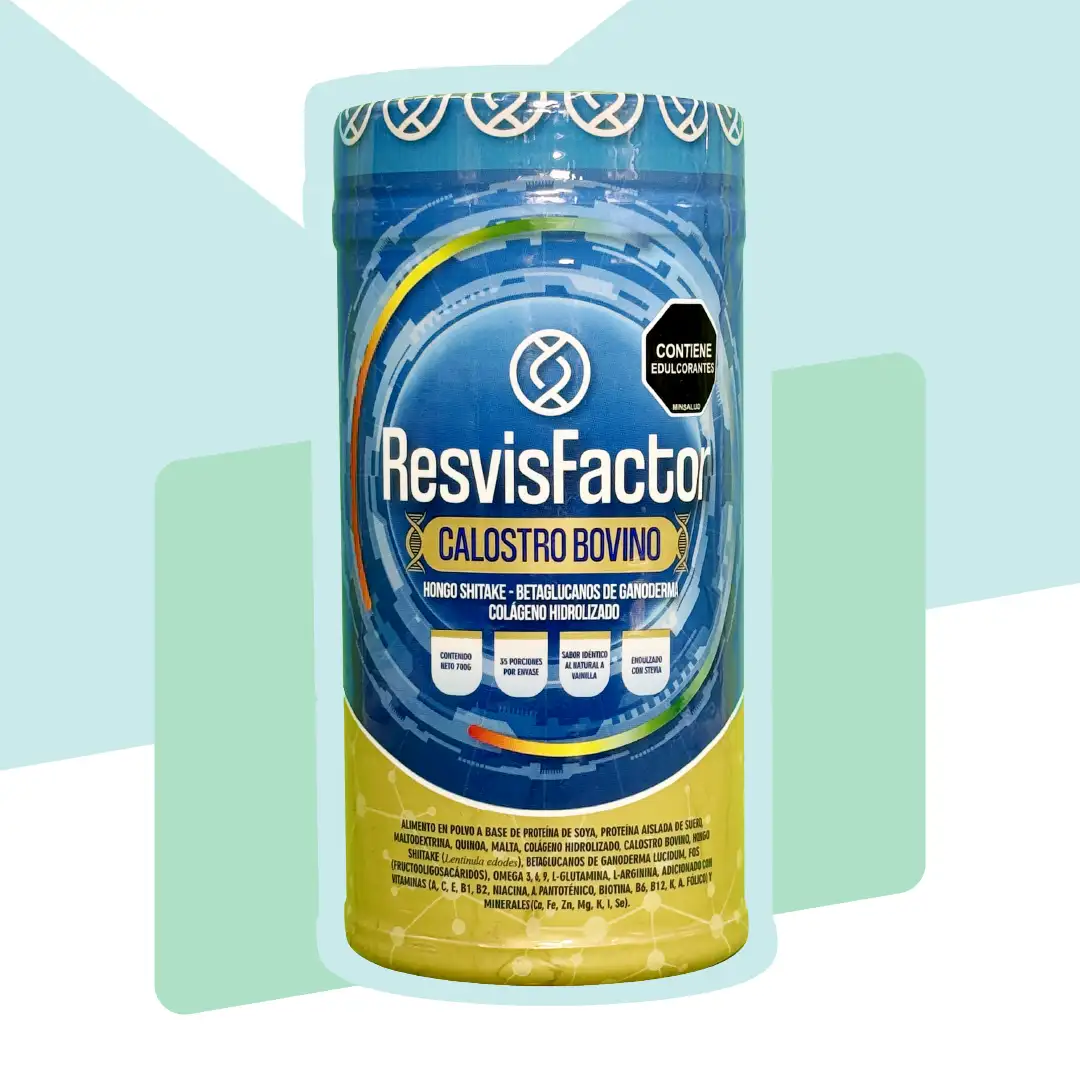 ResvisFactor es un suplemento alimenticio que combina los beneficios del calostro bovino, un componente rico en inmunoglobulinas, con otros ingredientes naturales como el hongo shiitake, colágeno hidrolizado, y Omega 3, 6 y 9.