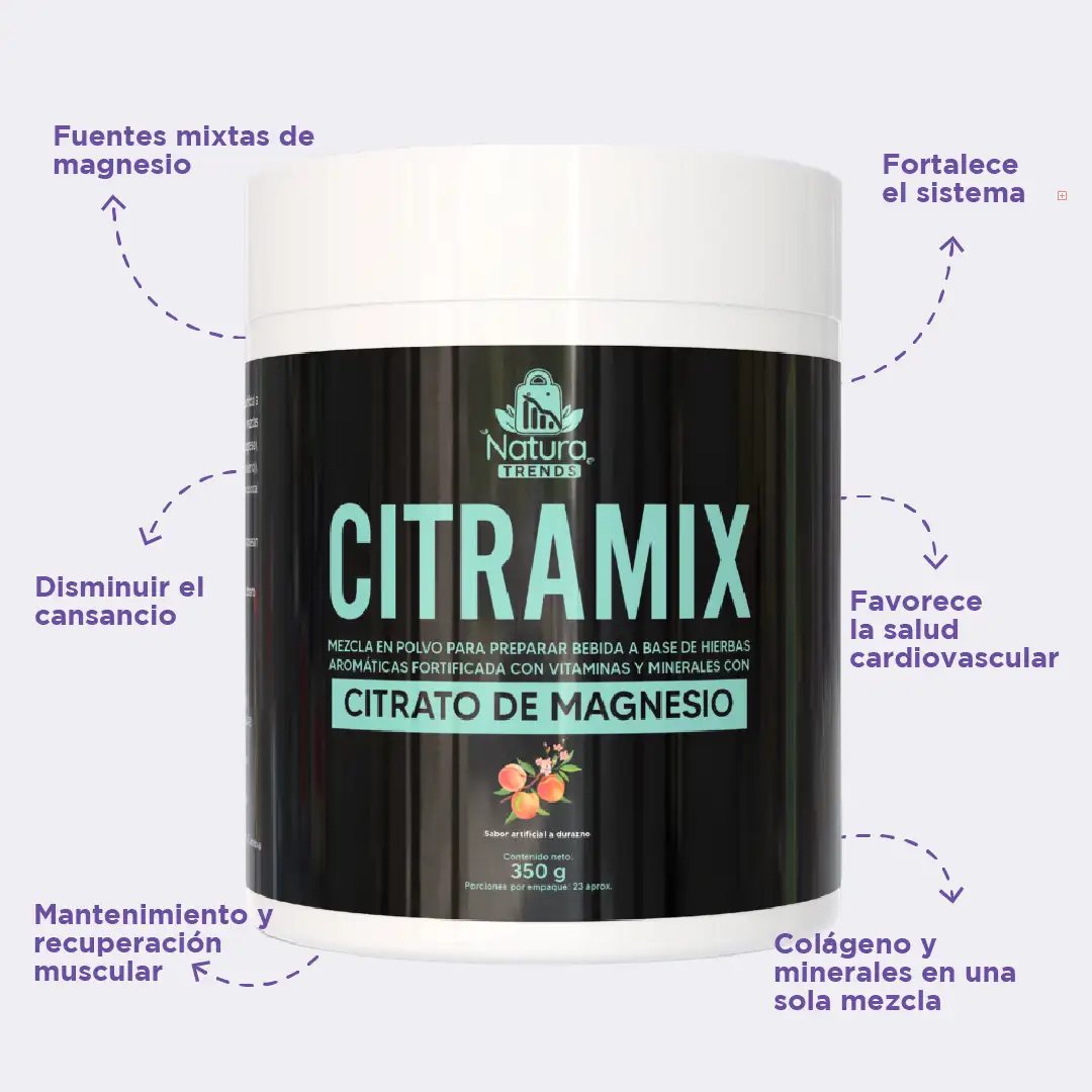 Citramix es un alimento en polvo que combina magnesio en formas citrato, bisglicinato y cloruro, junto con inulina, té verde, mezcla de vitaminas (A, C, D, E y complejo B) y minerales (Ca, Fe, Zn, Se).