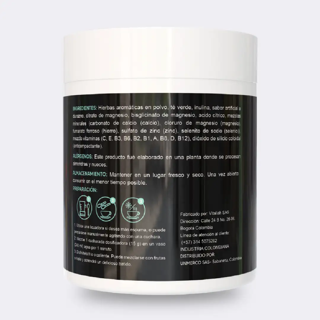 - Otros: inulina, té verde, hierbas aromáticas, ácido cítrico, mezcla de vitaminas A, C, D, E, B1, B2, B3, B6, B8, B12, minerales (Ca, Fe, Zn, Se), dióxido de silicio (anticompactante), sabor durazno.