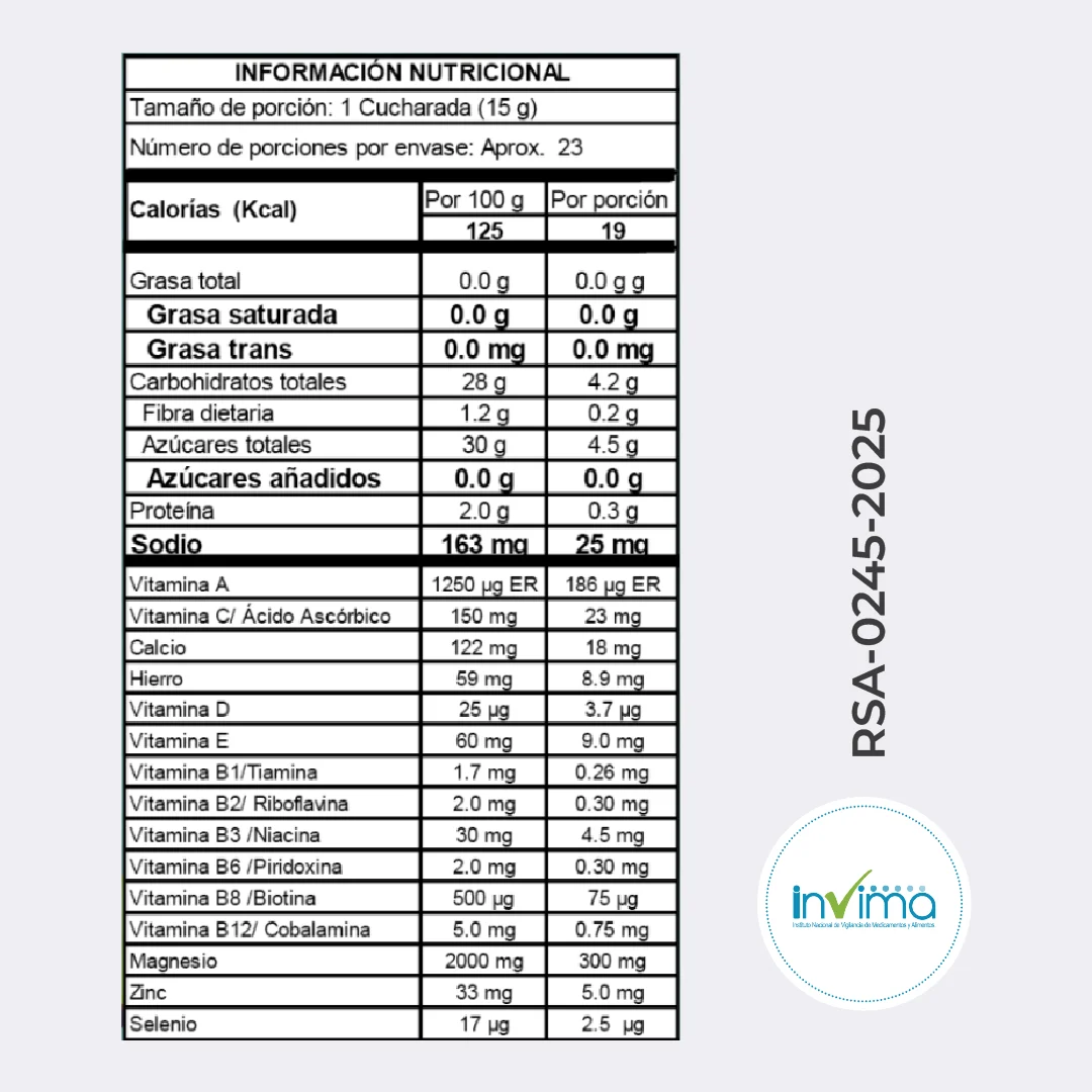 - Con vitaminas A, C, D, E y B-complex y minerales clave (Ca, Fe, Zn, Se).