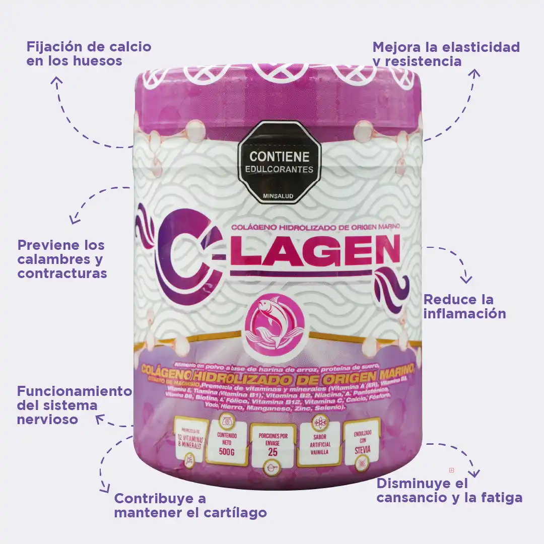 C-Lagen es un alimento en polvo a base de colágeno hidrolizado de origen marino, proteína de suero, citrato de magnesio y una premezcla de vitaminas y minerales.