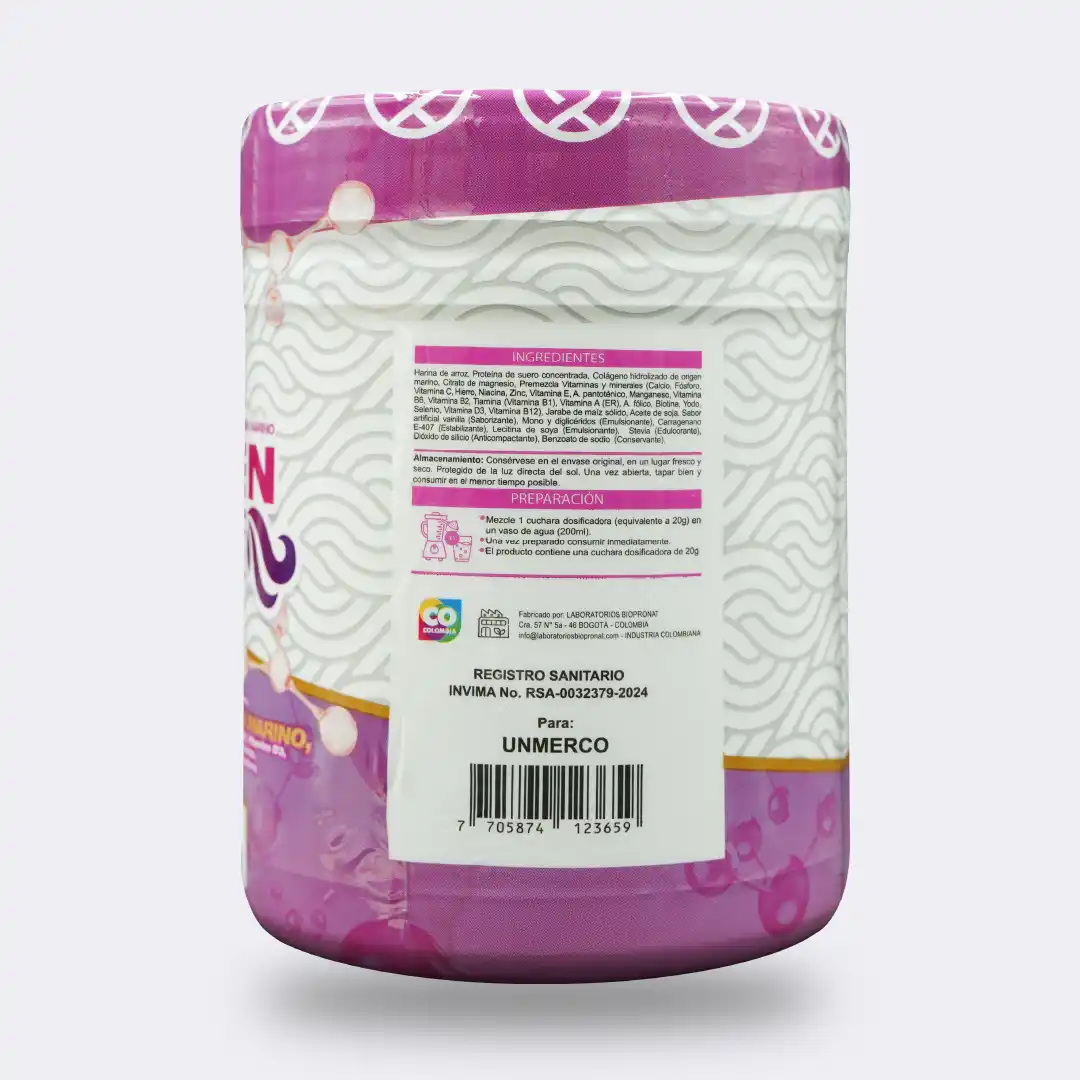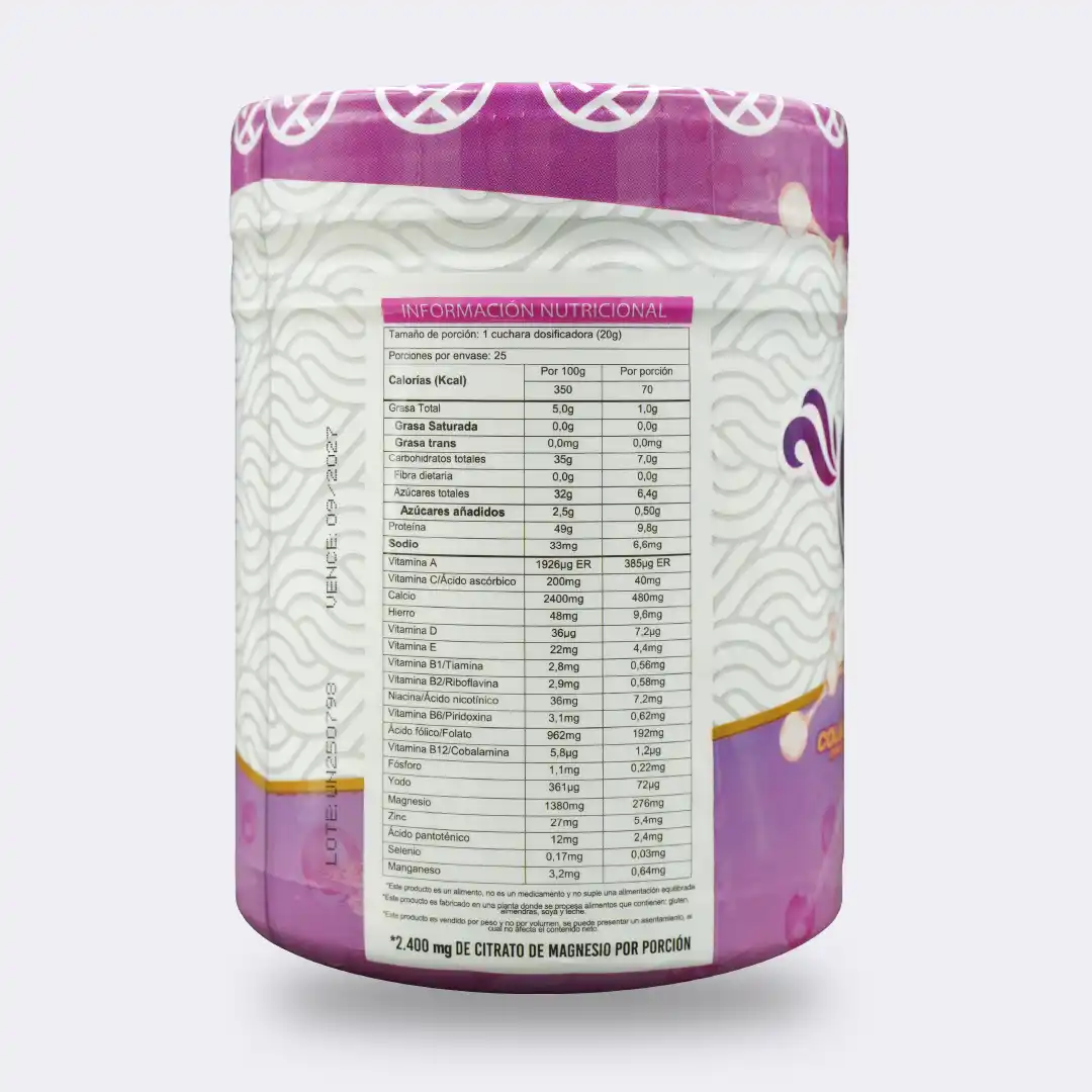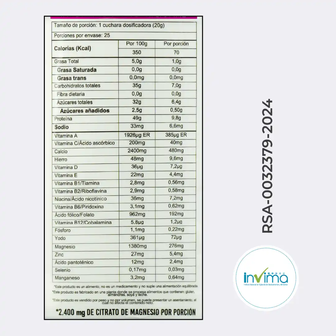 - Harina de arroz, proteína de suero concentrada, colágeno hidrolizado de origen marino, citrato de magnesio, premezcla de vitaminas y minerales (A, D3, E, B1, B2, niacina, ácido pantoténico, B6, biotina, ácido fólico, B12, C, calcio, fósforo, yodo, hierro, manganeso, zinc, selenio), jarabe de maíz, aceite de soya, sabor artificial a vainilla, mono y diglicéridos, carragenano, lecitina de soya, estevia, dióxido de silicio, benzoato de sodio.