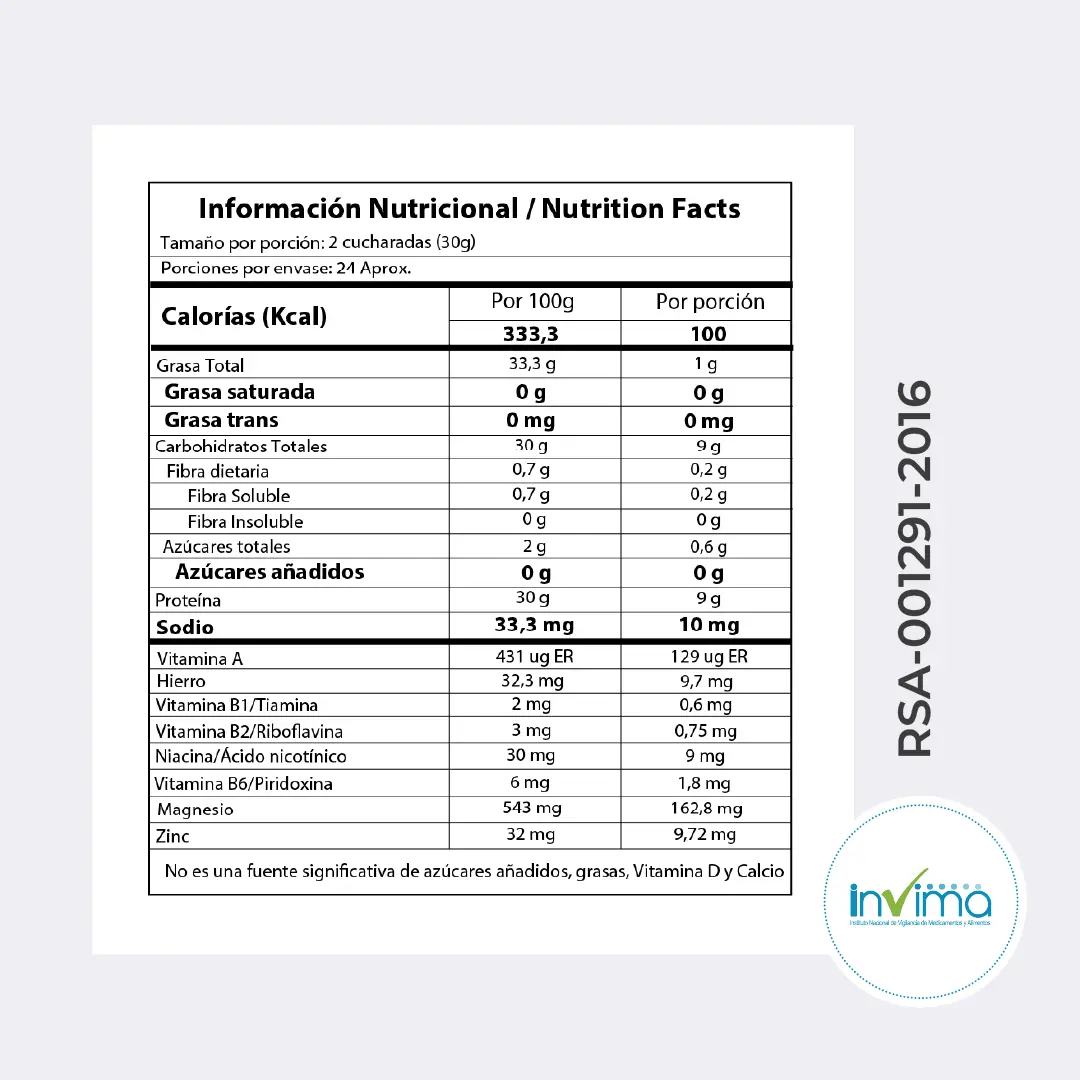 - Vitaminas: A, B1, B2, B6, Niacina, Hierro, Magnesio, Zinc