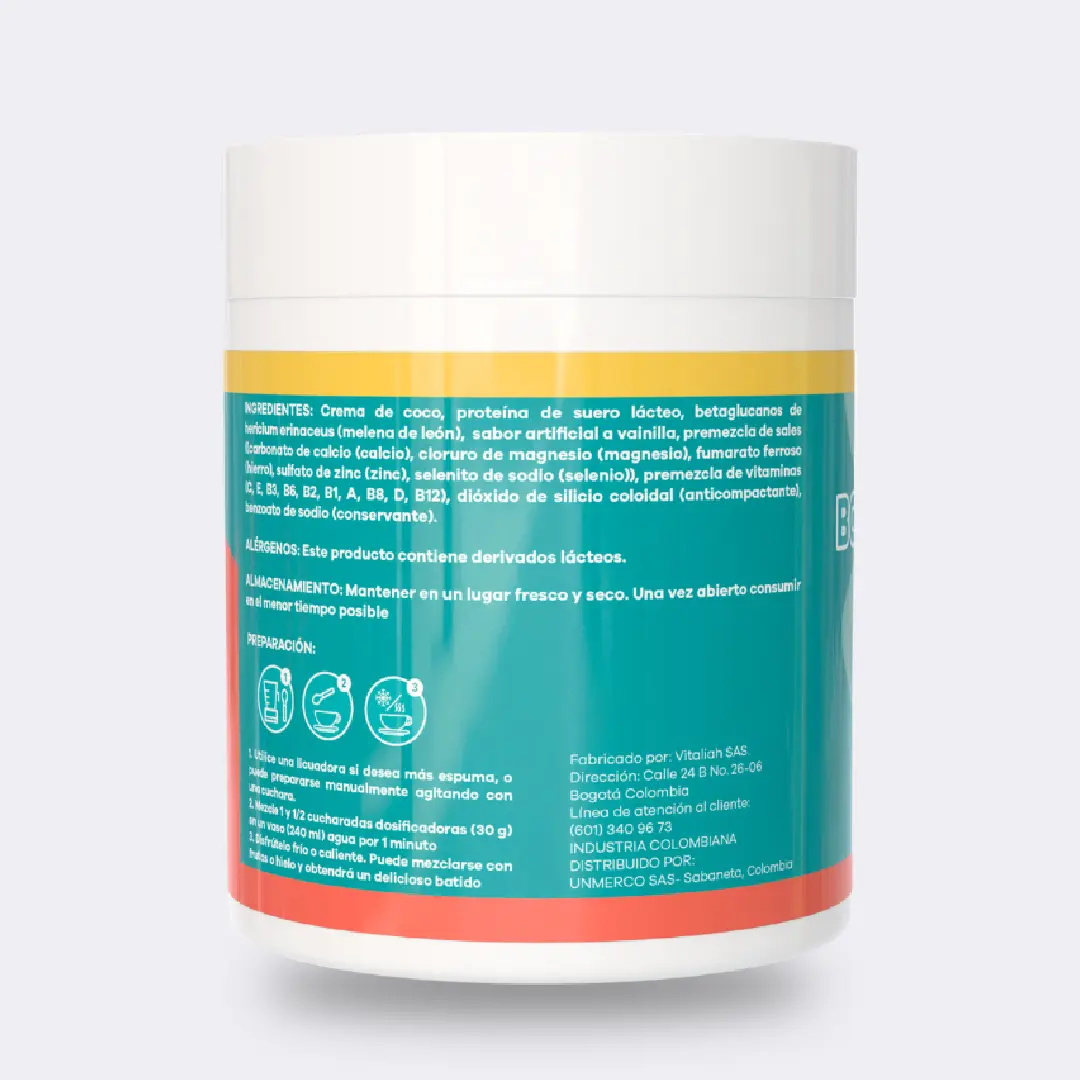 - Crema de coco, proteína de suero lácteo, betaglucanos de Hericium erinaceus (300 mg por porción de 30 g), sabor vainilla, vitaminas (C, E, B3, B6, B2, B1, A, B8, D, B12) y minerales (Ca, Mg, Fe, Zn, Se), dióxido de silicio (anticompactante), benzoato de sodio (conservante).