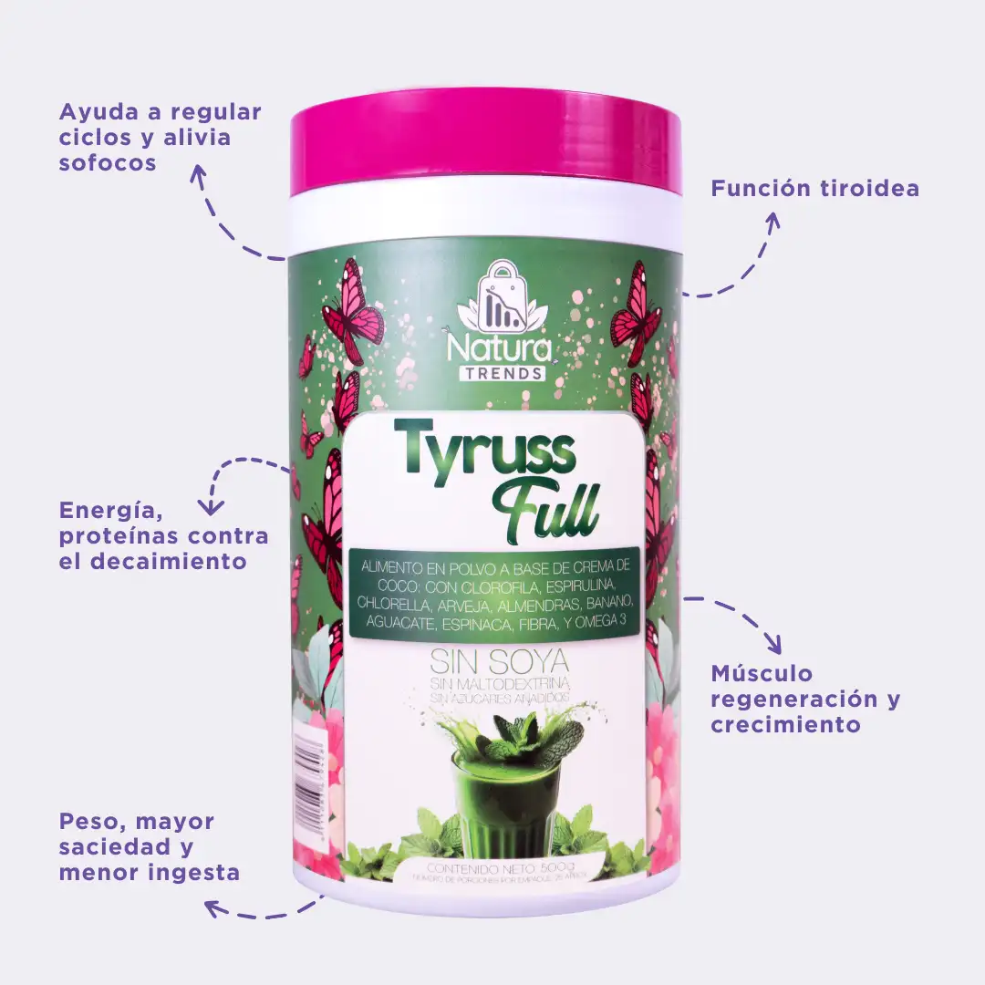 - Tyruss Full mejora la digestión, apoya el sistema inmunológico, promueve la salud del corazón y aporta energía sostenida. También ayuda a regular hormonas y fortalecer los músculos.