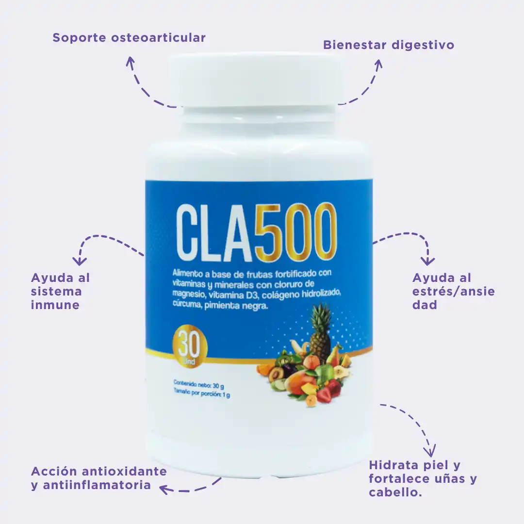 CLA 500 es un alimento a base de frutas fortificado con vitaminas y minerales. Incluye cloruro de magnesio, vitamina D3, colágeno hidrolizado, cúrcuma y pimienta negra.