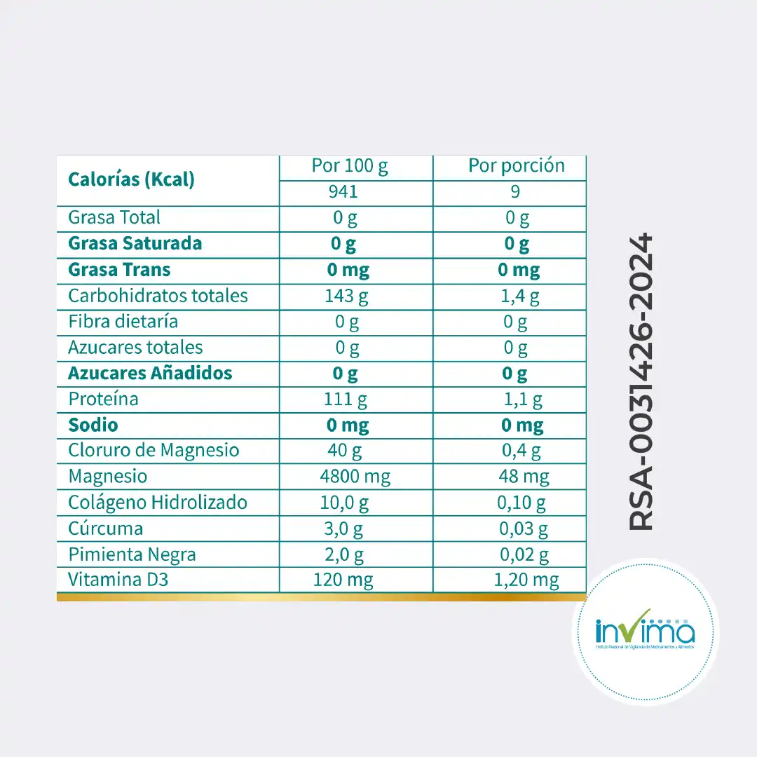 - Contribuye al metabolismo óseo (magnesio + D3). Mantén dieta rica en calcio y actividad física.
